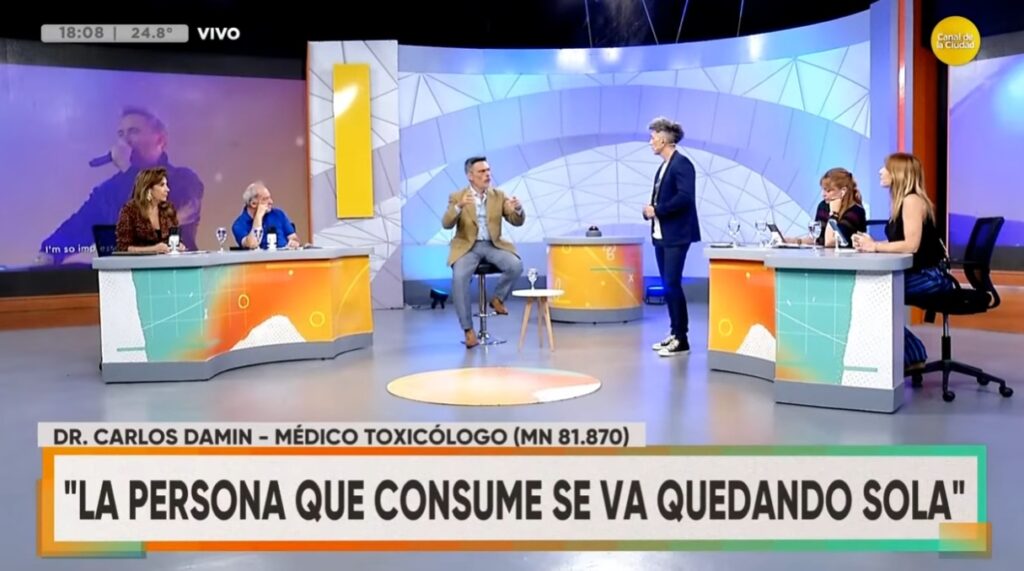 El video se centra en el consumo de drogas y la reducción de daños, con la participación del Dr. Carlos Damin, toxicólogo, y Juan M. Belvedere, excoordinador del proyecto PAF.